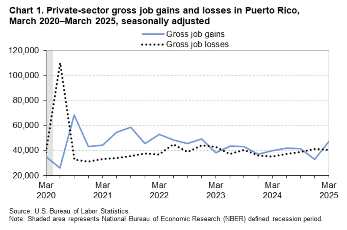 Puerto Rico’s private-sector labor market recorded a net gain of 6,488 jobs in the first quarter of 2025, reversing losses from the previous quarter, according to preliminary data from the U.S. Bureau of Labor Statistics.